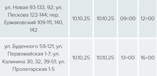 На трех улицах свет будет отключен с 09:00 до 12:00 в связи с техническим обслуживанием ЛЭП-0,4 кВ Л-1 ТП-305, еще на четырех улицах — с 13:00 до 16:00 — в связи с техническим обслуживанием ЛЭП-0,4 кВ Л-1 ТП-317.
