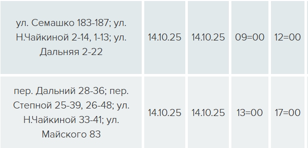 На трех улицах свет будет отключен с 09:00 до 12:00 в связи с техническим обслуживанием ЛЭП-0,4 кВ Л-1 ТП-336, еще на четырех улицах — с 13:00 до 17:00 — в связи с техническим обслуживанием ЛЭП-0,4 кВ Л-2 ТП-336.