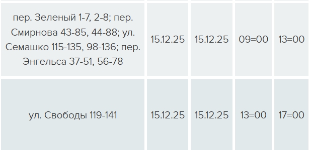 На четырех улицах свет будет отключен с 09:00 до 13:00 в связи с техническим обслуживанием ЛЭП-0,4 кВ Л-1 ТП-308, еще на одной улице — с 13:00 до 17:00 — в связи с техническим обслуживанием ЛЭП-0,4 кВ Л-1 ТП-324.