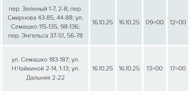 На четырех улицах свет будет отключен с 09:00 до 12:00 в связи с техническим обслуживанием ЛЭП-0,4 кВ Л-1 ТП-308, еще на трех улицах — с 13:00 до 17:00 — в связи с техническим обслуживанием ЛЭП-0,4 кВ Л-1 ТП-336.