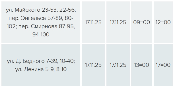 На трех улицах свет будет отключен с 09:00 до 12:00 в связи с техническим обслуживанием ЛЭП-0,4 кВ Л-3 ТП-330, еще на двух улицах — с 13:00 до 17:00 — в связи с техническим обслуживанием ЛЭП-0,4 кВ Л-9 ТП-326.