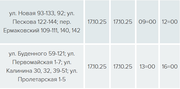 На трех улицах свет будет отключен с 09:00 до 12:00 в связи с техническим обслуживанием ЛЭП-0,4 кВ Л-2 ТП-302, еще на четырех улицах — с 13:00 до 16:00 — в связи с техническим обслуживанием ЛЭП-0,4 кВ Л-1 ТП-317.