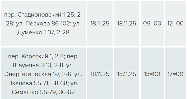 На трех улицах свет будет отключен с 09:00 до 12:00 в связи с техническим обслуживанием ЛЭП-0,4 кВ Л-2 ТП-318, еще на пяти улицах — с 13:00 до 17:00 — в связи с техническим обслуживанием ЛЭП-0,4 кВ Л-5 ТП-032.