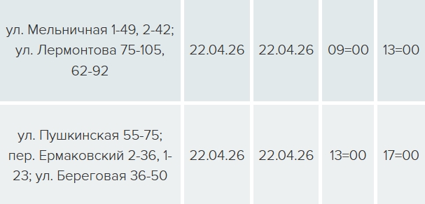 На двух улицах свет будет отключен с 09:00 до 13:00 в связи с техническим обслуживанием ЛЭП-0,4 кВ Л-2 ТП-328, еще на трех улицах — с 13:00 до 17:00 — в связи с техническим обслуживанием ЛЭП-0,4 кВ Л-2 ТП-314.