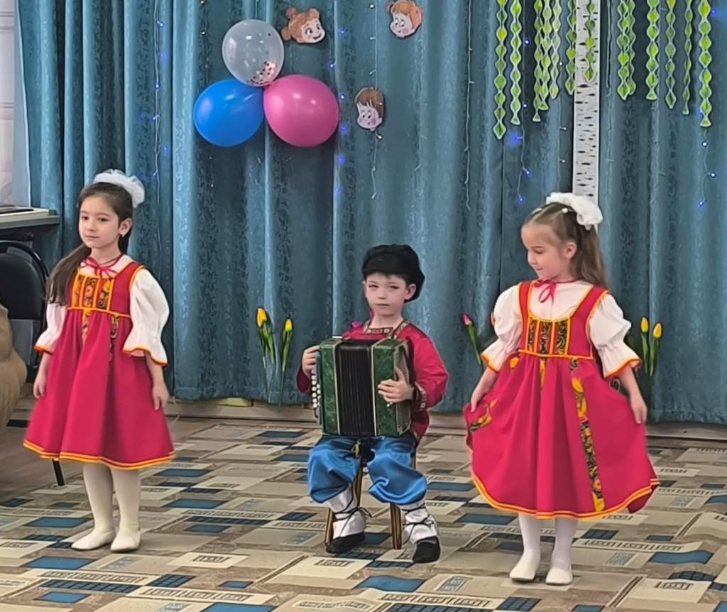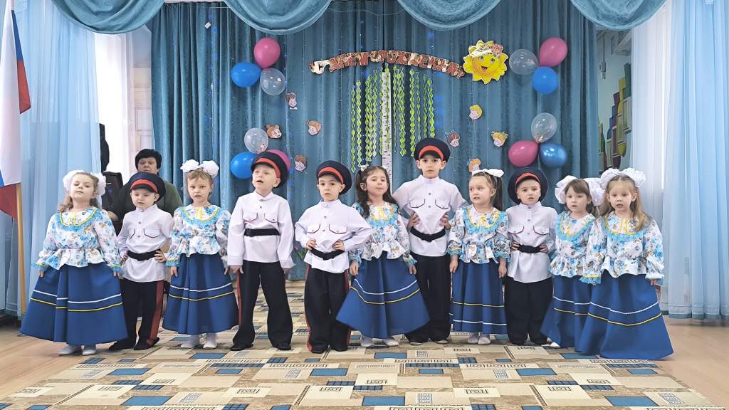 Младшие ребята играли на ложках, дети средней группы исполнили песню «Мы с тобой казаки!», трио группы «Казачок» показали яркий номер «Гармонист Тимошка». В заключении все вместе спели песню «Любимый детский садик».