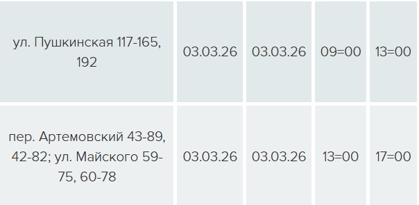 На одной улице свет будет отключен с 09:00 до 13:00 в связи с техническим обслуживанием ЛЭП-0,4 кВ Л-3 ТП-301, еще на двух улицах — с 13:00 до 17:00 — в связи с техническим обслуживанием ЛЭП-0,4 кВ Л-3 ТП-301.