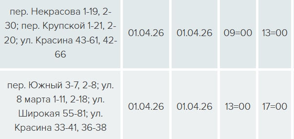 На трех улицах свет будет отключен с 09:00 до 13:00 в связи с техническим обслуживанием ЛЛЭП-0,4 кВ Л-3 ТП-311, еще на четырех улицах — с 13:00 до 17:00 — в связи с техническим обслуживанием ЛЭП-0,4 кВ Л-2 ТП-311.
