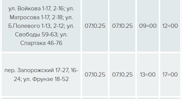На пяти улицах свет будет отключен с 09:00 до 12:00 в связи с техническим обслуживанием ЛЭП-0,4 кВ Л-5 ТП-319, еще на двух улицах — с 13:00 до 17:00 — в связи с техническим обслуживанием ЛЭП-0,4 кВ Л-7 ТП-321.