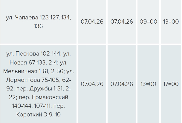 На одной улице свет будет отключен с 09:00 до 13:00 в связи с техническим обслуживанием оборудования ТП-346, еще на семи улицах — с 13:00 до 17:00 — в связи с техническим обслуживанием оборудования ТП-302.
