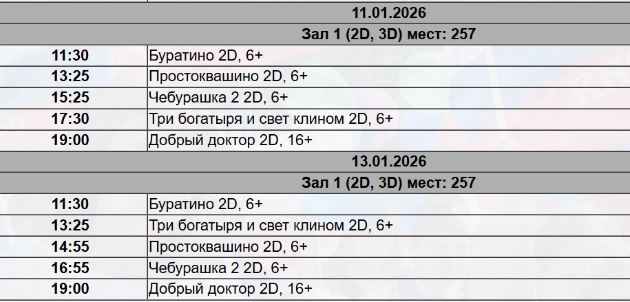Расписание сеансов кинотеатра на 11 и 13 января 2026 года