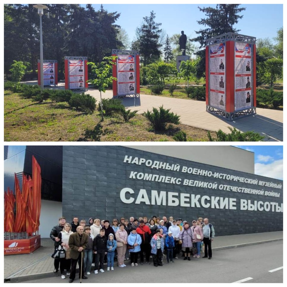 Фотоколлаж: вверху — Аллея Героев в Багаевском районе, внизу — АНО ЦСО «Добродетель» для получателей социальных услуг организована экскурсия в военно-исторический музей «Самбекские высоты»