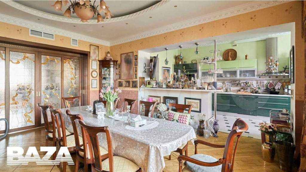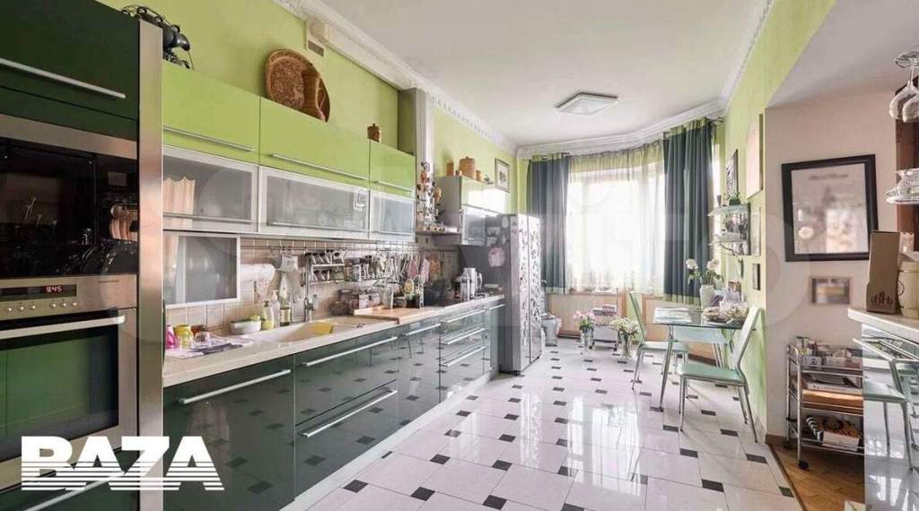 Кухня достаточно просторная, стены оливкового цвета, кафель чёрно-белый, потолок выполнен в стиле «а-ля филармония». Холодильник стоимостью около 160 тысяч рублей покрыт магнитиками. Единственное, что кажется устаревшим, — мебель. Но, как известно, «на вкус и цвет товарищей нет».