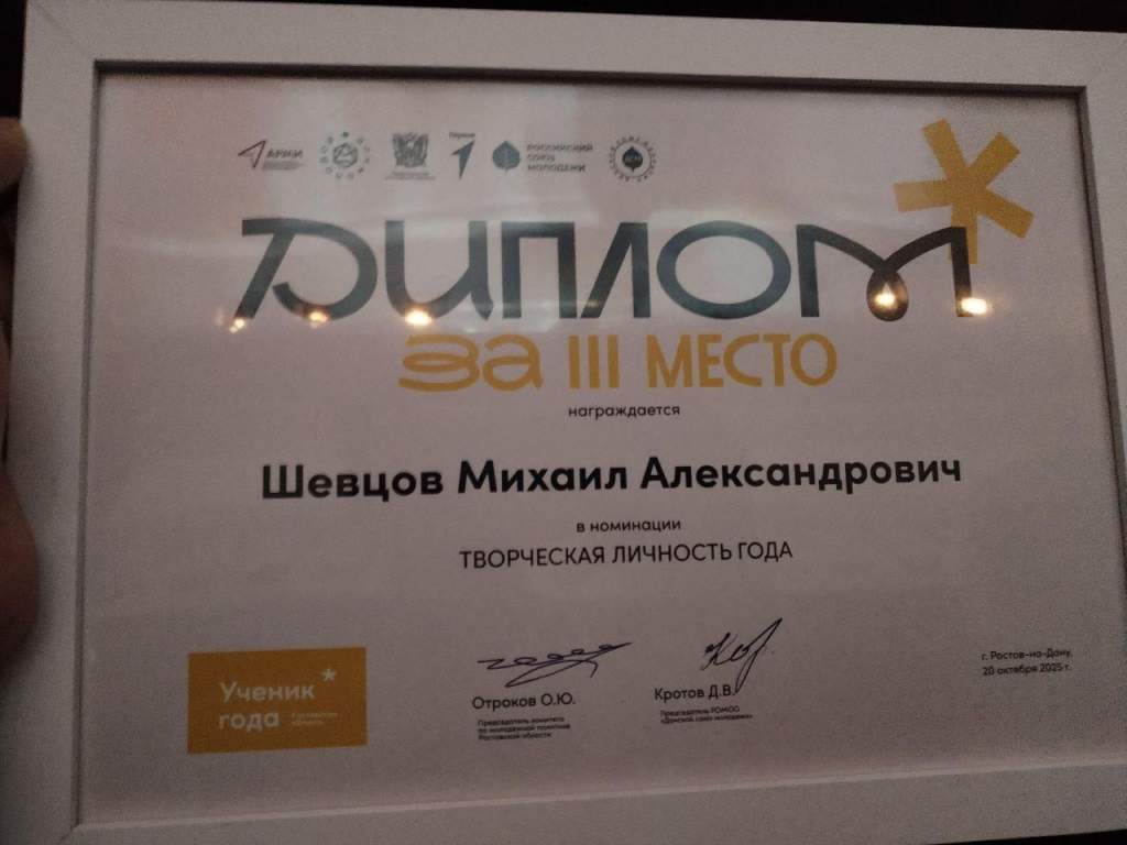 По результатам конкурса ученик 11 класса Багаевской школы №2 Михаил Шевцов занял почетное 3-е место в номинации «Творческая личность года».