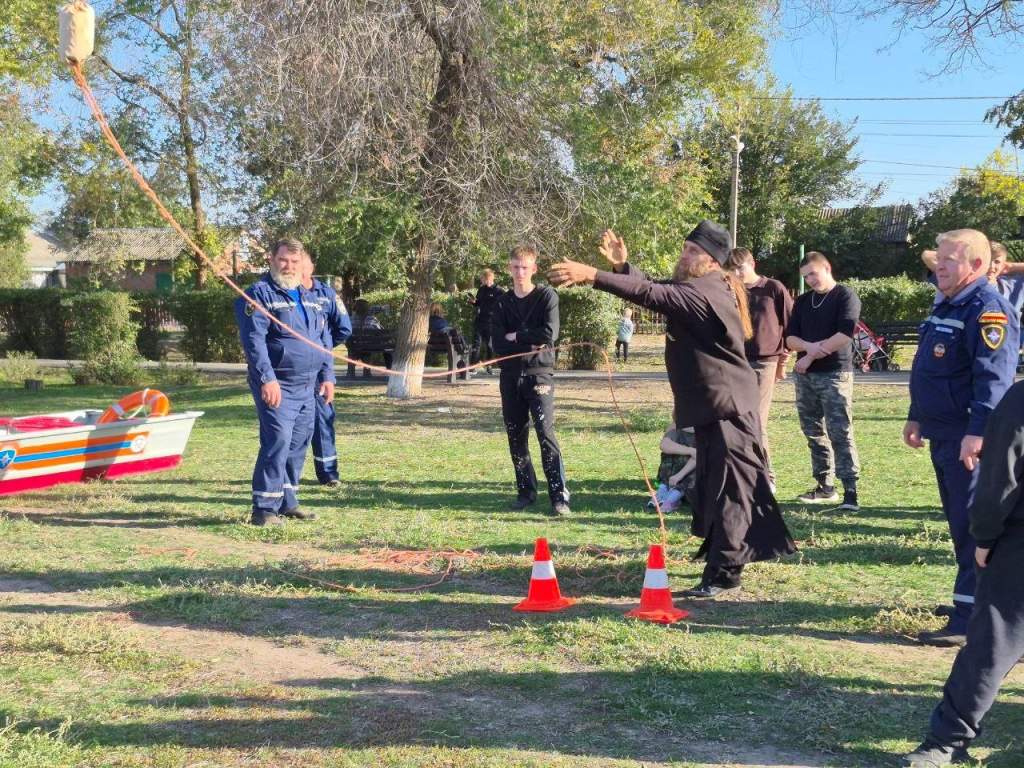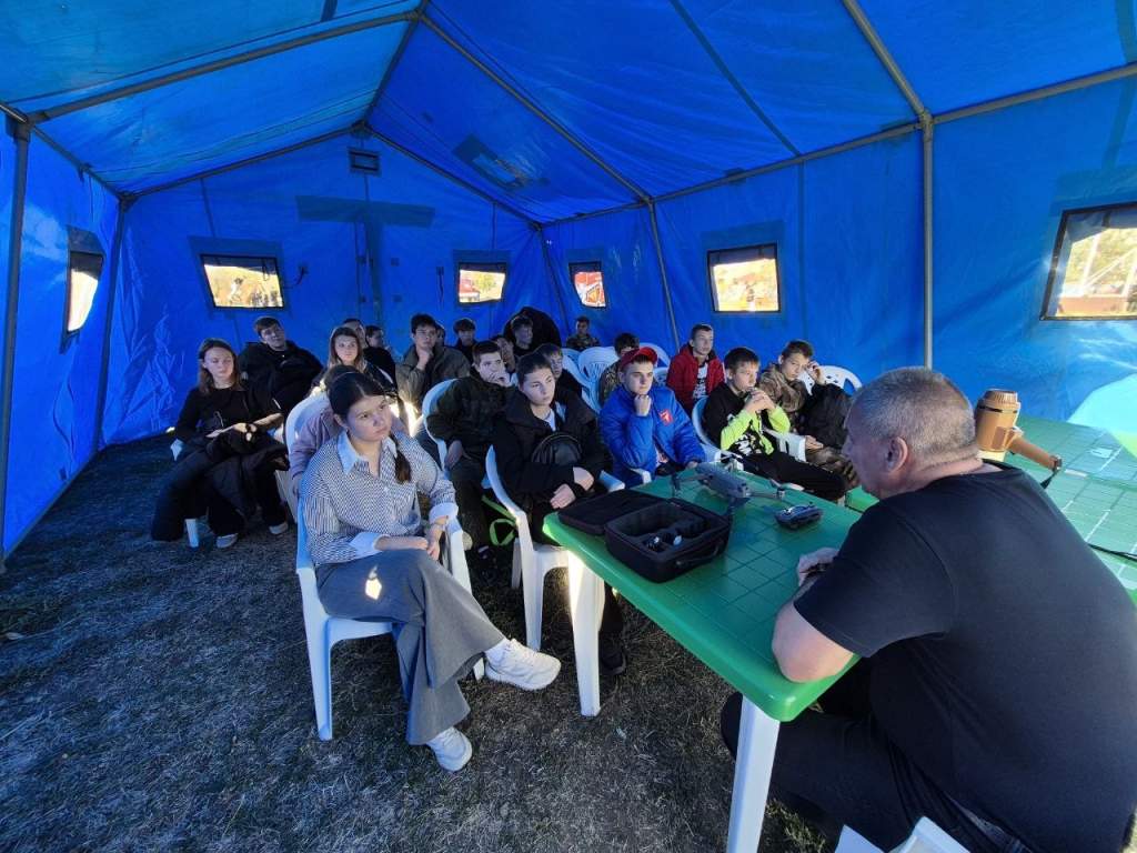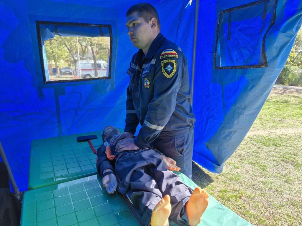 В каркасных палатках проходил урок выживания, где любой желающий мог задать вопрос службе спасения Ростовской области, оказать первую помощь утопающему на учебном манекене.