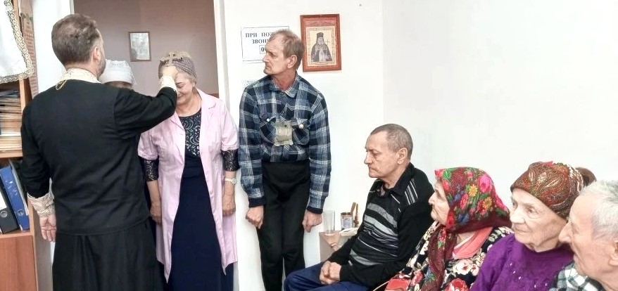 Настоятель храма святой блаженной Ксении Петербургской, протоиерей Роман Мясников окропил святой водой продукты, сотрудников и получателей социальных услуг.