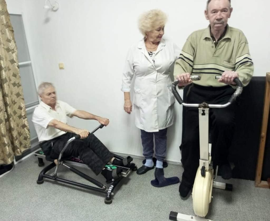 Для этого в социально-реабилитационном отделении имеется спортивный инвентарь, включая шведскую лестницу и велотренажёр.