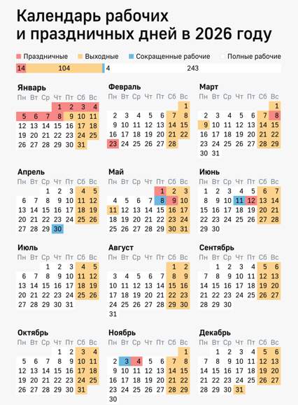 23 февраля, который в 2026 году выпадает на понедельник, станет нерабочим днем, присоединившись к двум традиционным выходным. При этом рабочий день 20 февраля останется полным, так как он не предваряет непосредственно праздник.