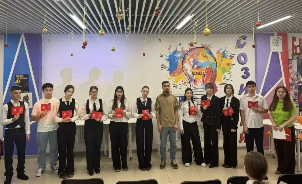 Мероприятие объединило патриотическую беседу с участником спецоперации Александром Сорокиным и торжественную церемонию вручения паспортов подросткам.