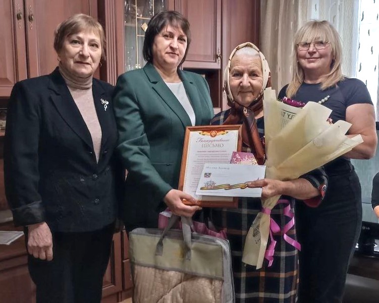 Гости вручили Надежде Викторовне поздравительные открытки от президента России Владимира Путина и губернатора Ростовской области Юрия Слюсаря. От имени главы Администрации Багаевского района Александра Черных ей были переданы цветы и памятный подарок.