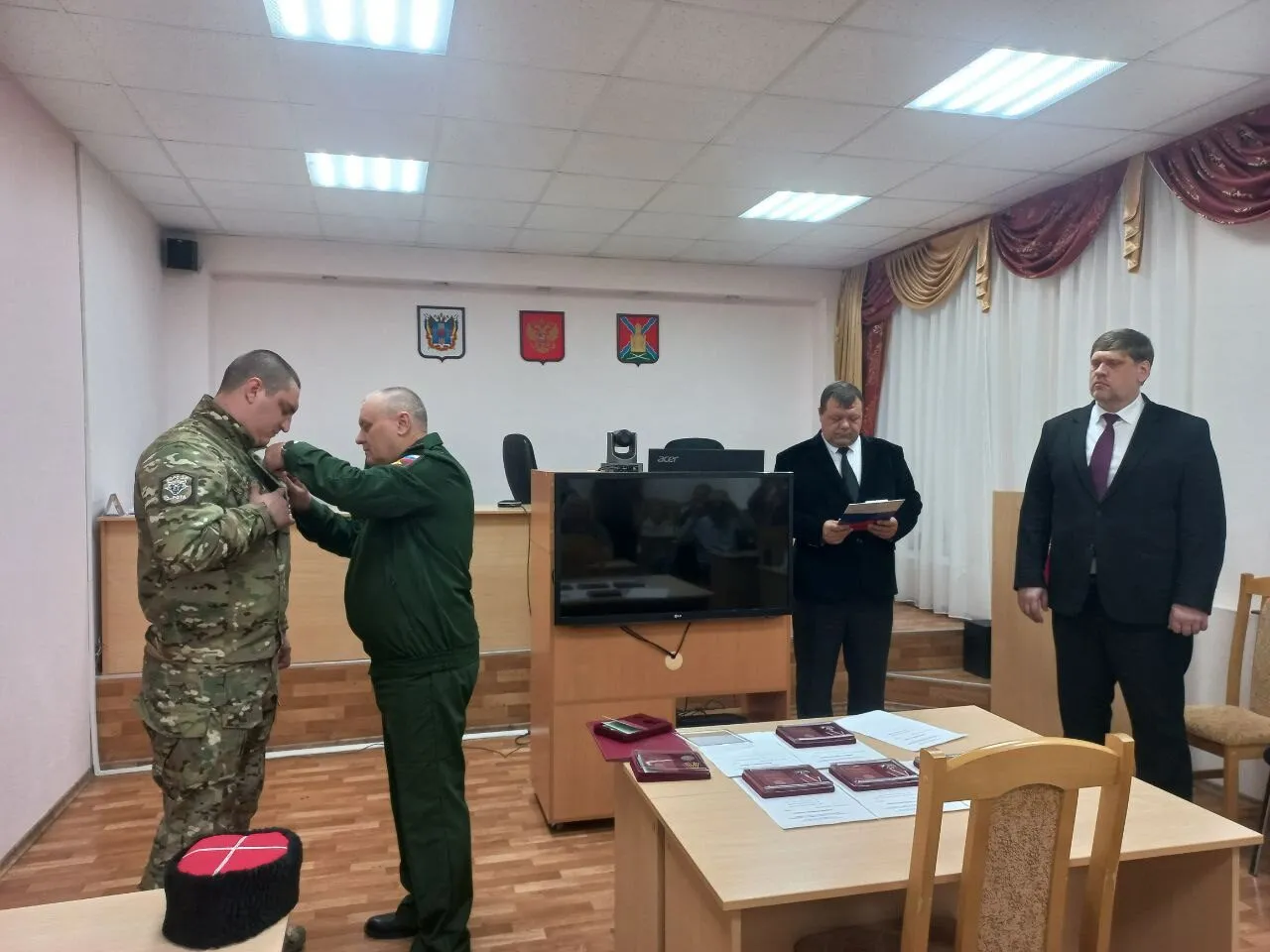 В актовом зале Администрации Багаевского района прошло торжественное мероприятие по вручению государственной награды — «Медаль за храбрость» 2-й степени рядовому Алексею Офицерову, командиру отделения огневой поддержки добровольческого формирования «БАРС».