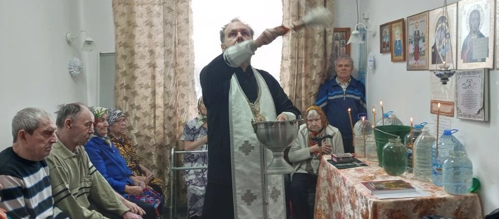 А в социально-реабилитационном отделении поселка Садовый настоятель храма святой блаженной Ксении Петербургской, протоиерей Роман Мясников совершил водосвятный молебен, подарив пожилым людям духовное утешение и радость праздника.